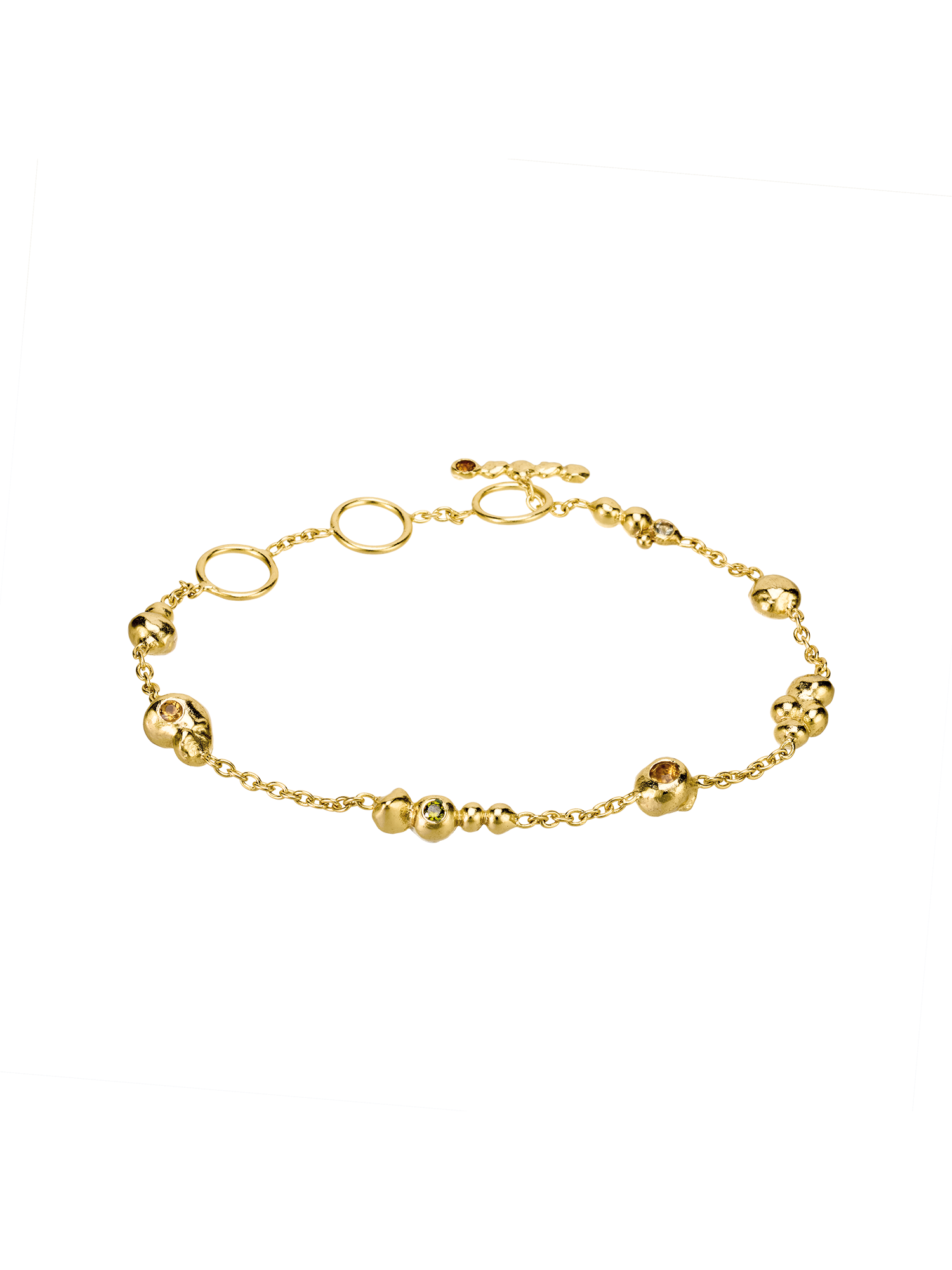 MIX DE PIERRES FINES (TOURMALINES, CITRINES, ZIRCONS ET QUARTZ CITRON) AUX COULEURS VARIANT ENTRE LES TONS BRUNS, OCRES ET OLIVES INCRUSTÉES DANS LE BIJOU EN SERTIS CLOS.